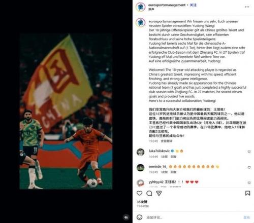 该公司发文宣布,“我们非常高兴向大家介绍我们的最新球员:王钰栋!这位18岁的进攻球员被认为是中国最具天赋的球员之一,他以速度快、高效的射门能力和出色的比赛阅读能力而闻名。王钰栋已经代表中国国家队出场6次(并攻入1球),并且刚刚在浙江队度过了一个非常成功的赛季。在27场比赛中,他攻入11球并贡献5次助攻。期待与钰栋的成功合作!”